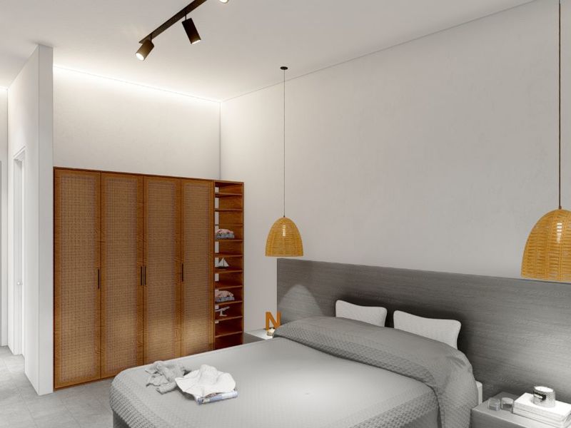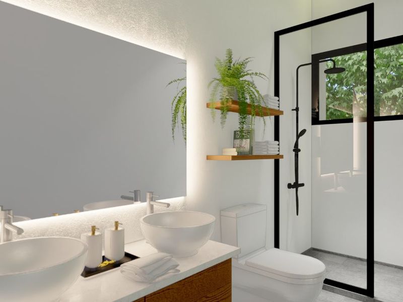 On opposite ends of the home are the 2 guest rooms which are identical in size. Each rooms has large windows with green planters giving a blend of privacy and light. There is an ensuite bathroom for each bedroom and these rooms will benefit from built in closets also.