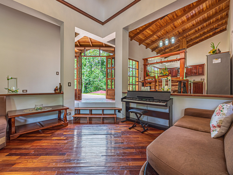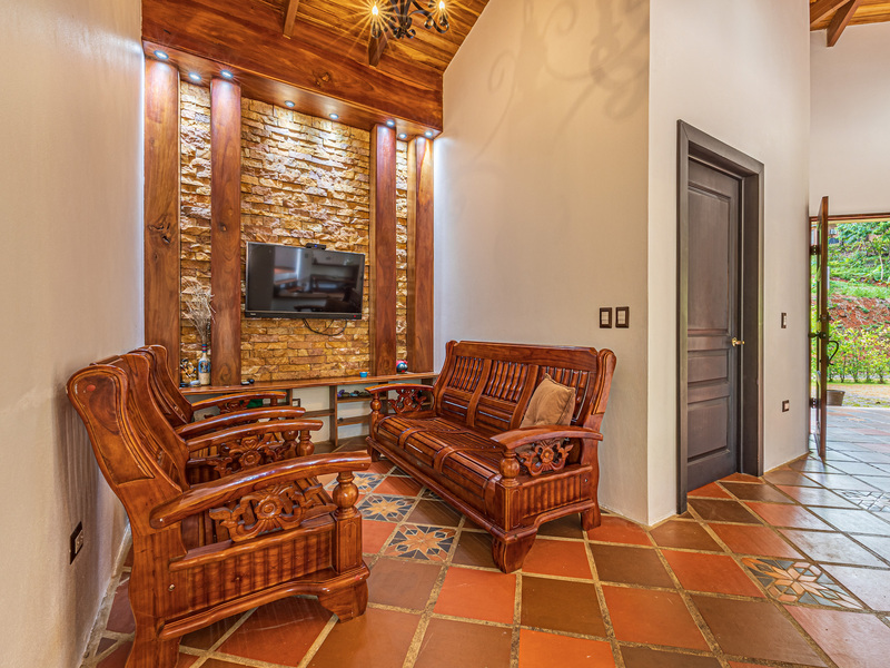 The TV area showcases the famous and beautiful wood found in Costa Rica, infusing the space with warmth and showcasing the country's rich natural resources. It provides a comfortable spot for entertainment and relaxation.