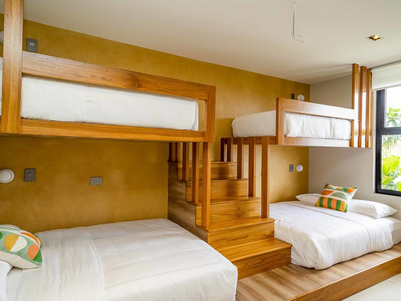 While the bedrooms are all private and designed to provide views from each space, the real showpiece of the home are the two top floors which host an enormous open floor plan kitchen, living and dining area for everyone to share, and the rooftop terrace and pool. The main common living, dining, and kitchen features floor to ceiling windows and a spacious atrium area, making you feel like you are suspended in the jungle canopy.
