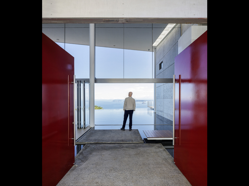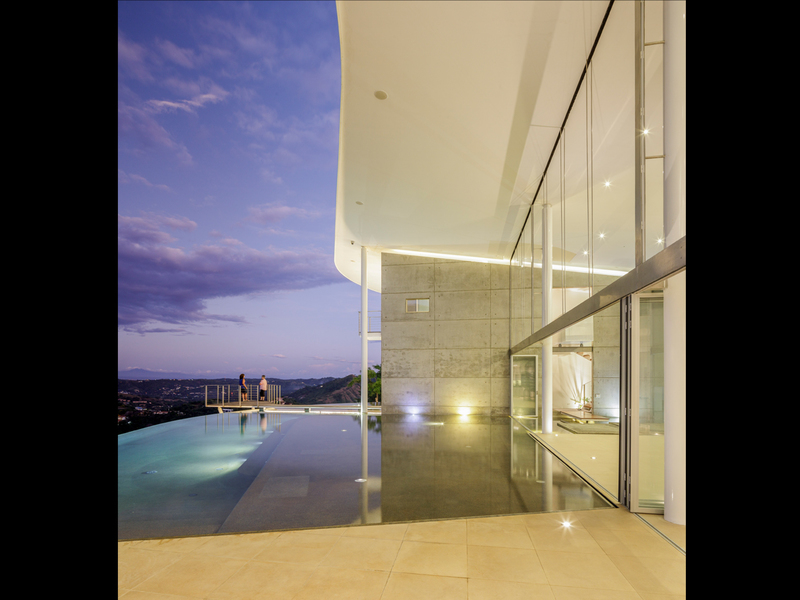 From an outdoor entry court, the reflecting pool crosses the lobby, becomes a swimming pool and blends with the sea and the horizon.