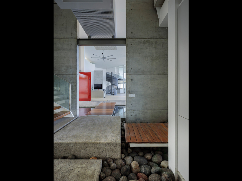 The entry hall, designed as several concrete steppingstones in the water is in the double height main space of the house. On the left are the living room, dining room and a spiral staircase that leads to a short bridge (both of perforated metal) that leads to a bedroom upstairs. Beneath this bedroom, the kitchen with a breakfast terrace strategically located at the west end of the house has an extensive sea view.
