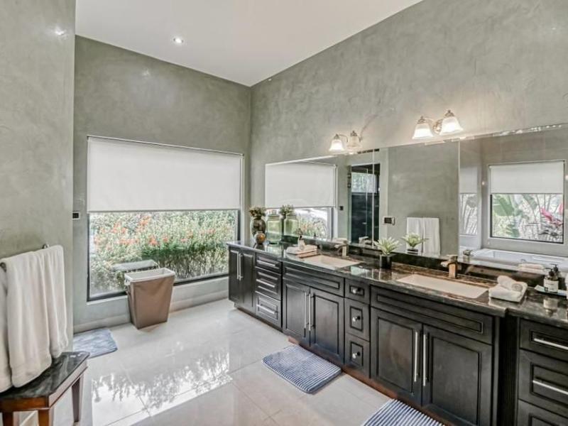 The bedrooms are distributed across two floors. The first-floor master bedroom has a stunning en suite bathroom with a steam shower, jacuzzi, double vanity, and a private entrance to the terrace and outdoor shower nook. This floor has two more spacious rooms with lovely views of the front yard and distant mountains. Three bedrooms, each with its own distinct style and impeccable design, are located on different wings of the second floor. A wraparound balcony connects the game room and a bedroom to the outside, overlooking the swimming pools and gardens and providing the property's best sunset views.
