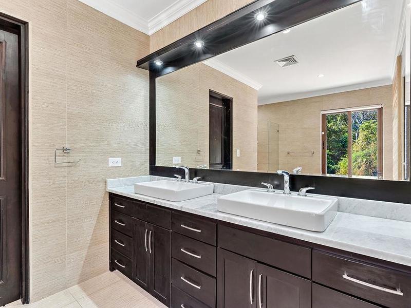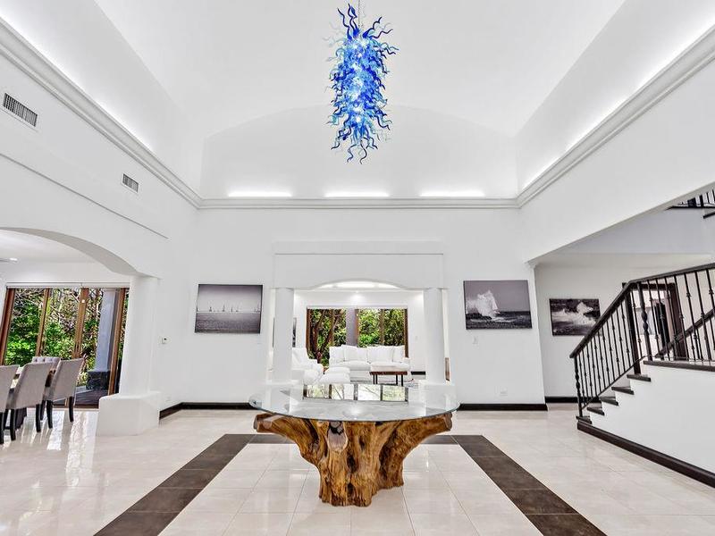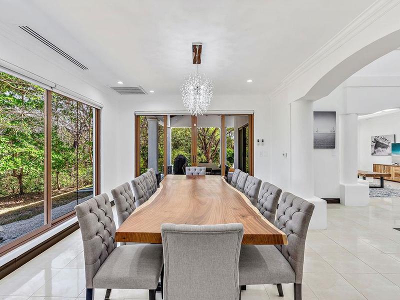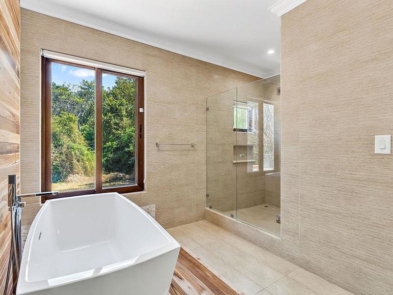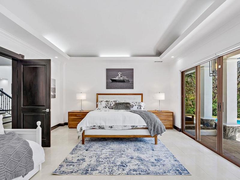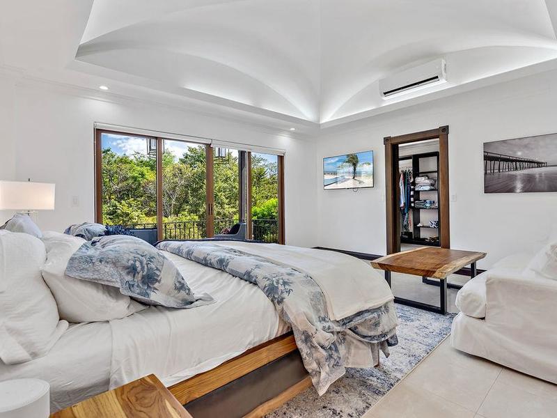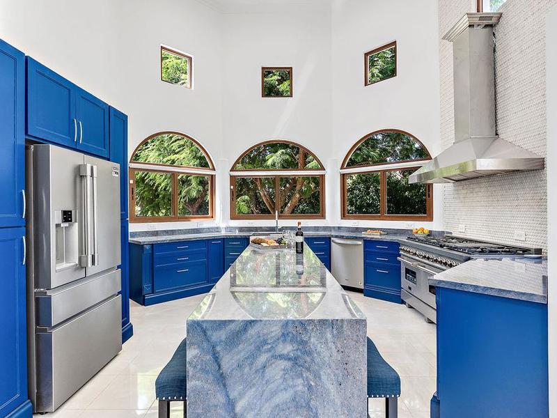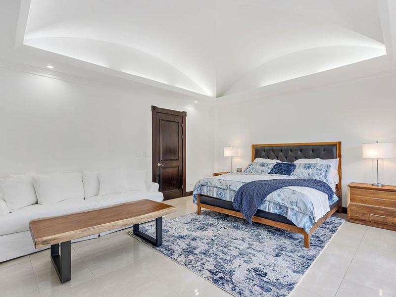 A meticulously detailed modern 7,500 sq. ft. (700 sq. mts.) home with luxury finishes, large bedrooms, and pool is ready for its new owners. Each bedroom has an ensuite bathroom with marble tile and finishes, as well as large showers and privacy for each guest. Three bedrooms, a media room, a rotunda entryway, a dining room, a living room, and a luxury kitchen are located downstairs. Two bedrooms are located upstairs, and there is a view of the pool area and trees where monkeys like to hang out. The kitchen at Casa Victoria has a large farm sink, dual fuel (electric/gas) oven and stove combination, stainless-steel refrigerator, ultra-quiet Kitchen-Aide dishwasher, wine refrigerator, large blue and gray quartzite island, large pantry, custom soft close cabinets, and seating for 14 at the dining areas.