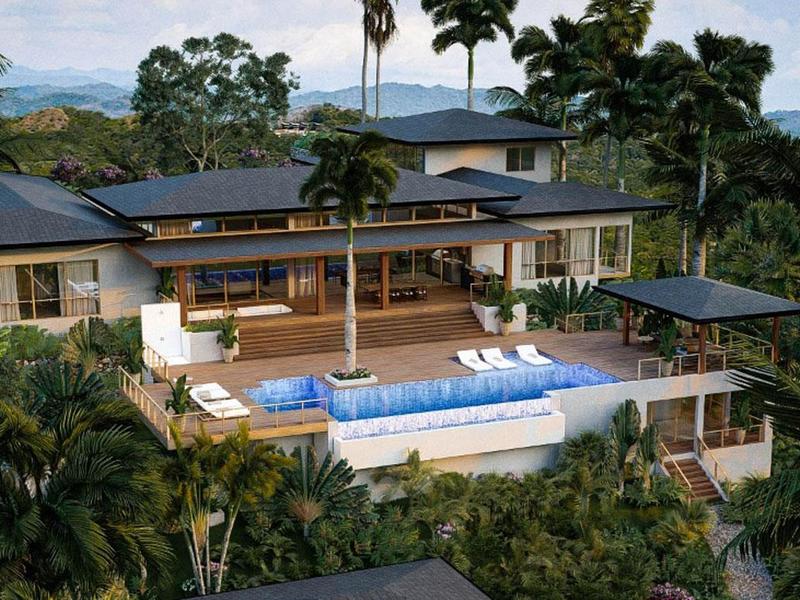 The whole home has five master bedroom suites (all with en-suite baths), a full one-bedroom apartment for nanny/service guests, a gym/yoga room, a game room, an outdoor kitchen palapa, a three-car garage, and much more.