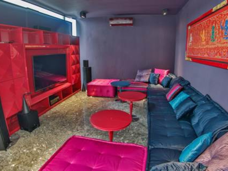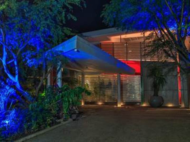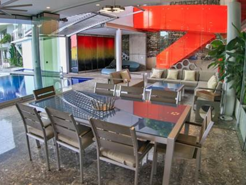 The art deco style orange staircase leads to 4 bedrooms, each with unique mosaic tiled ensuite bathrooms and walls of glass with gorgeous views. Most open onto a private veranda overlooking the terraces, pool and tropical gardens below. The stunning coastal views from the principal bedroom encompass mountain, ocean and the boats in the bay below.