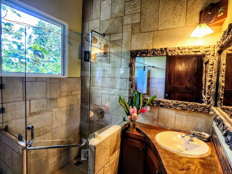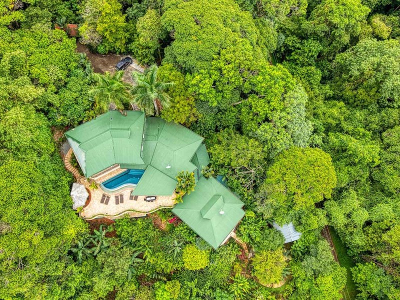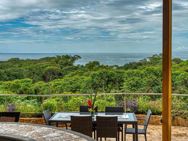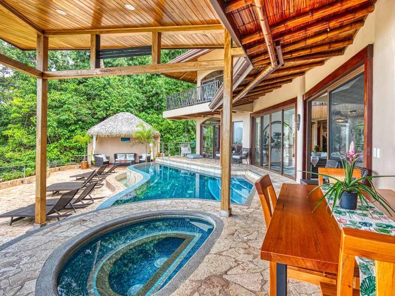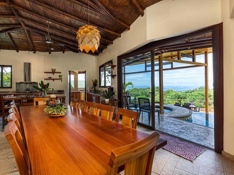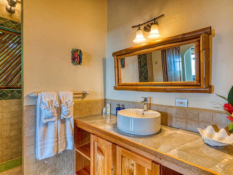 Upon entering the property, you will follow a short driveway to a 5-car parking area. You will be greeted near the front door by a trickling waterfall and pond. Immediately upon entering the front door of the main Villa you will be wowed by the view of the infinity pool, the expansive wrap-around balcony, and of course, the never-ending view of jungle, mountains, and ocean.