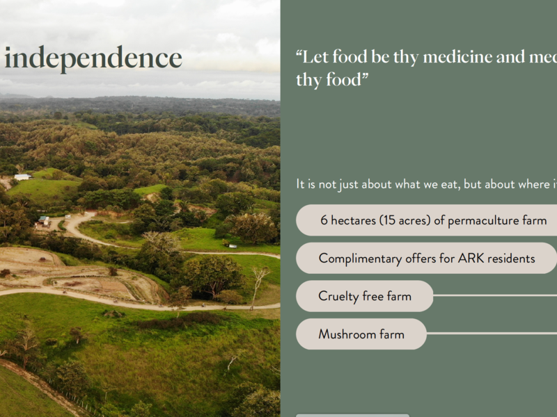 Two hundred acres of green hilly land with majestic views on mountain, ocean and jungle of Costa Rica unite The ARK as a physical manifestation of a regenerative autonomous way of living, fully powered by solar energy and supported by an immense fifteen acre syntropic farm.
