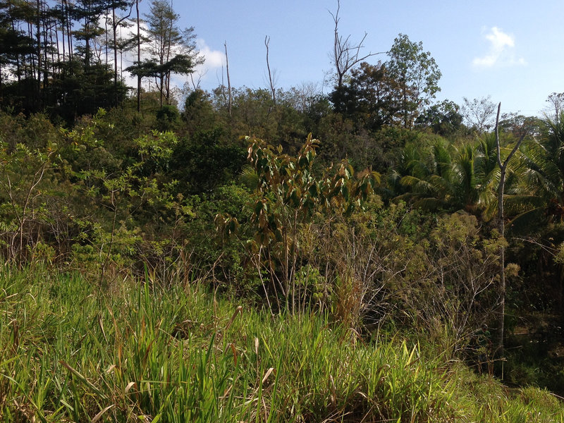 There are wide variety of trees on the property, with over 20 coconuts, 2 mature mangos, bamboo and diverse other fruit trees. Along the stream are more of the larger trees with smaller ones covering other areas.