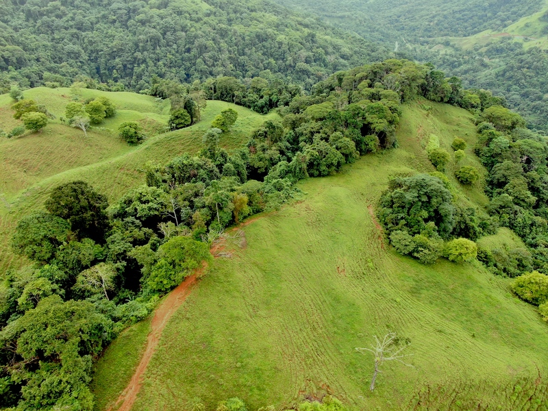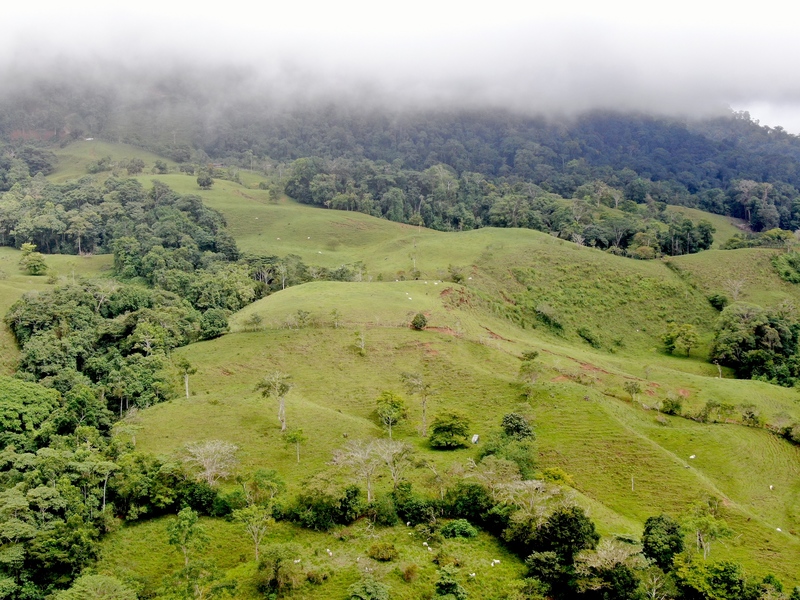 The topography is gently sloping and very flat in many areas, and currently being used for cattle grazeland along with a few horses. The farm fronts public road, and drops down in to the edge and beyond to a river valley below that is fed by several spring and small rivers and eventually flows out to the north side of Uvita as the Morete River. So consider this section to be the headwaters to the Morete!