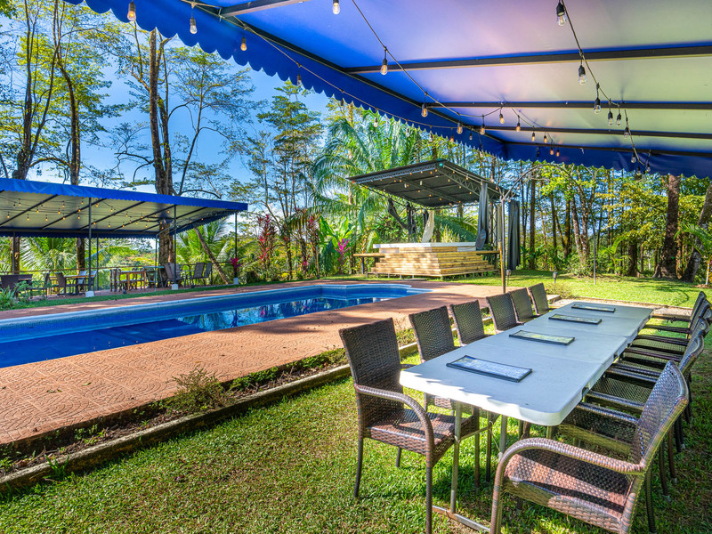 Leading out to the pool area, there are two newly built covered areas with additional seating for patrons, as well as an additional bathroom. This allows clients to enjoy the beautiful surroundings and pool area while they dine. The covered stage area offers the perfect space for hosting live music events or special occasions like weddings and birthdays poolside, creating an amazing entertainment experience! There are also three greenhouses on the property, where produce for the restaurant is cultivated and harvested every week.